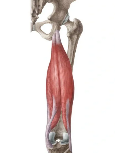 The hamstrings are a group of three muscles located in the back of the thigh: the semimembranosus, semitendinosus, and biceps femoris. These muscles are responsible for flexing the knee and extending the hip. The hamstrings originate at the ischial tuberosity (sit bones) of the pelvis and insert on the tibia (shinbone) and the head of the fibula (smaller bone in the leg)